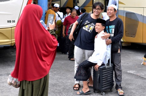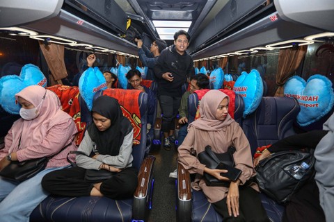 Sejumlah santri menaiki bus saat mengikuti mudik bareng di parkiran makam KH Abdurrahman Wahid atau Gus Dur Tebuireng, Kabupaten Jombang, Jawa Timur, Sabtu (30/3/2024). Foto: ANTARA FOTO/Syaiful ArifSebanyak 4 ribu santri Pesantren Tebuireng mudik bareng jelang perayaan Idul Fitri 1445 Hijriah. Foto: ANTARA FOTO/Syaiful ArifSebagian penumpang transportasi darat yang didominasi mahasiswa, pelajar dan santri tujuan Sumatera Utara, Padang, Riau, dan Pulau Jawa memilih untuk mudik lebih awal sebagai upaya menghindari penumpukan penumpang saat puncak arus mudik hari raya Idul Fitri 1445 H. Foto: ANTARA FOTO/Khalis SurryFoto: ANTARA FOTO/Khalis SurryFoto: ANTARA FOTO/Fikri Yusuf