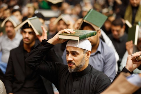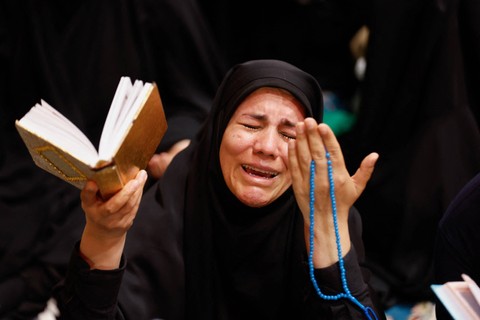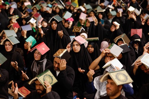 Umat Syiah membaca Al-Quran dan berdoa saat ibadah pada bulan suci Ramadan di kota suci Najaf, Irak, (29/3/2024).
