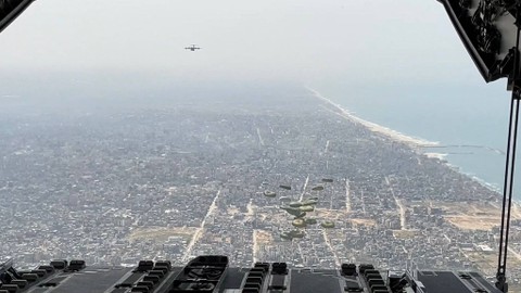Angkatan Udara Spanyol menjatuhkan paket bantuan kemanusiaan di Jalur Gaza, Rabu (27/3/2024). Foto: Kementerian Luar Negeri Spanyol/Handout via Reuters