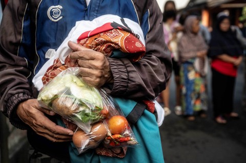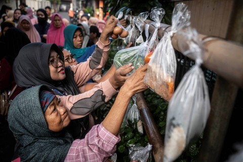 Sejumlah warga mengambil bahan makanan dalam acara bazar kebutuhan pokok gratis di kawasan Jati Padang, Jumat (29/3/2024). Foto: Aprillio Akbar/ANTARA FOTO
