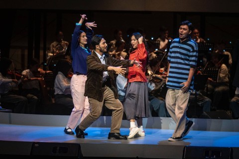Aktris Sherina Munaf dan mantan atlet Nyoman Paul (kanan) tampil dalam Konser Musikal Memeluk Mimpi-mimpi di Taman Ismail Marzuki, Jakarta, Rabu, (24/4/2024). Foto: Erlangga Bregas Prakoso/ANTARA FOTO