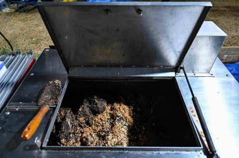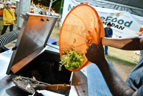 Setelah berbuka puasa Ramadan di luar masjid di Malaysia, orang-orang membuang sisa makanan mereka ke dalam mesin yang mengubah sisa makanan menjadi pupuk organik untuk tanaman.