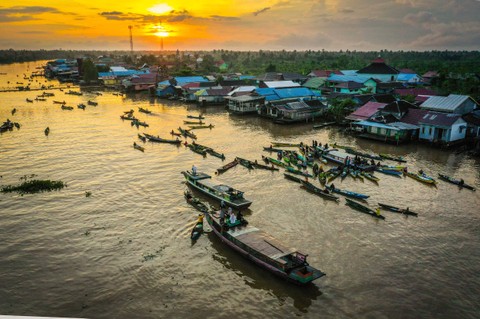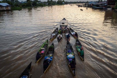 Foto udara sejumlah pedagang menjajakan dagangannya di atas perahu (jukung) di Pasar Terapung Lok Baintan, Kabupaten Banjar, Kalimantan Selatan, Kamis (18/4/2023). Foto: ANTARA FOTO/Bayu Pratama SPasar yang berada di aliran Sungai Martapura tersebut merupakan pasar tradisional yang menjual beragam dagangan hasil produksi pertanian dan perkebunan masyarakat setempat dari atas Jukung. Foto: ANTARA FOTO/Bayu Pratama SFoto: ANTARA FOTO/Bayu Pratama SFoto: ANTARA FOTO/Bayu Pratama SFoto: ANTARA FOTO/Bayu Pratama S
