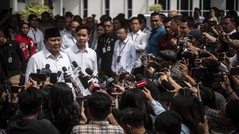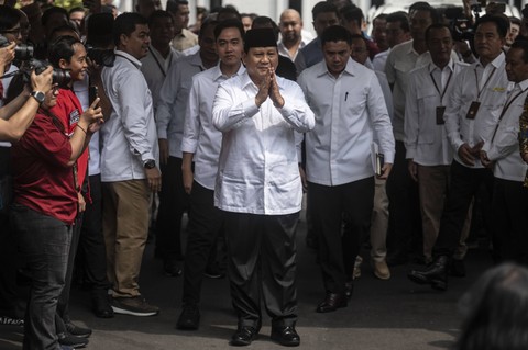 Calon presiden dan calon wakil presiden nomor urut 2, Prabowo Subianto (tengah) bersama Gibran Rakabuming Raka (tengah kiri) bersiap mengikuti rapat pleno terbuka penetapan pasangan calon Presiden dan Wakil Presiden terpilih Pemilu 2024 di depan Gedung Komisi Pemilihan Umum (KPU), Jakarta, Rabu (24/4/2024). Foto: ANTARA FOTO/Aprillio AkbarPasangan capres dan cawapres Prabowo Subianto dan Gibran Rakabuming Raka tiba di kantor KPU, Jakarta Pusat, Rabu (24/4), untuk menghadiri penetapan pemenang Pilpres 2024. Foto: ANTARA FOTO/Aprillio AkbarPrabowo dan Gibran terlihat serasi mengenakan pakaian kemeja berwarna putih.Mereka berangkat dengan menggunakan mobil Toyota Alphard berwarna putih dengan pelat nomor 108 PSD. Foto: ANTARA FOTO/Aprillio AkbarPrabowo dan Gibran akan ditetapkan sebagai pemenang Pilpres 2024 oleh KPU hari ini. Penetapan Pemenang Pilpres 2024 akan dilaksanakan KPU pukul 10.00 WIB. Setelah penetapan ini, PRabowo dan Gibran resmi menjadi presiden dan wakil presiden terpilih. Foto: Zamachsyari/kumparan