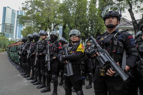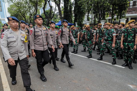 Tim pengamanan gabungan TNI dan Polri melakukan apel jelang penetapan Presiden dan Wakil Presiden hasil Pemilu 2024 di depan kantor KPU, Jakarta, Rabu (24/4/2024). Foto: Jamal Ramadhan/kumparan