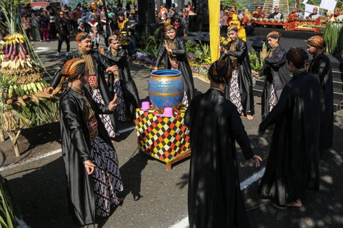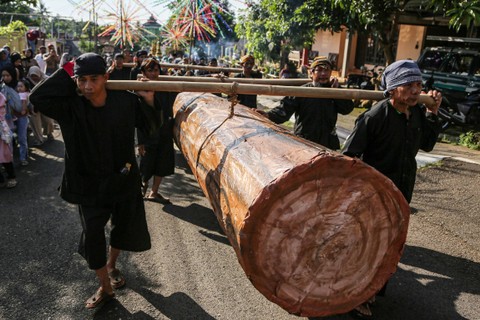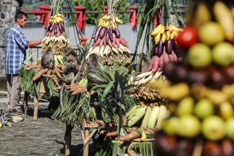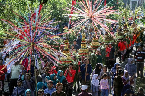 Sejumlah warga memikul berbagai hasil bumi saat mengikuti kirab budaya tradisi Sesaji Rewanda di Goa Kreo, Gunungpati, Semarang, Jawa Tengah, Sabtu (20/4). Foto: Makna Zaezar/ANTARA FOTOTradisi ini digelar Dinas Kebudayaan dan Pariwisata Kota Semarang setiap bulan Syawal. Foto: Makna Zaezar/ANTARA FOTOUntuk mengenang napak tilas Kanjeng Sunan Kalijaga saat mencari kayu jati yang akan digunakan untuk membangun tiang atau Soko Guru Masjid Agung Demak yang dibantu kawanan kera di Goa Kreo, sekaligus sebagai upaya meningkatkan kunjungan wisatawan. Foto: Makna Zaezar/ANTARA FOTOFoto: Makna Zaezar/ANTARA FOTO