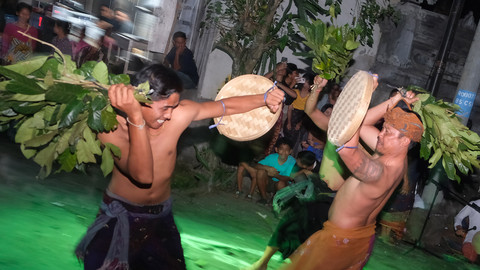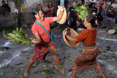 Dua warga saling memukul menggunakan daun langsat saat tradisi grudug langsat di Banjar Langsat, Desa Rendang, Karangasem, Bali, Rabu (23/4/2025). Foto: ANTARA FOTO/Nyoman Hendra Wibowo